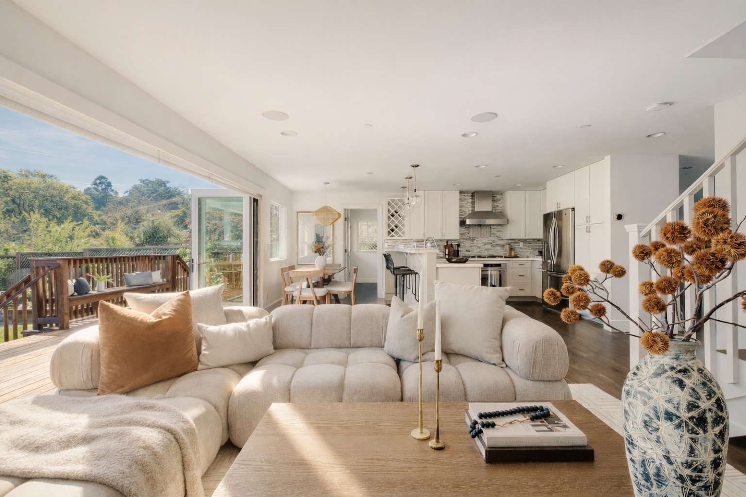 Designed to blur the line between indoors and out, a NanaWall system opens wide to a generous, sun-drenched backyard retreat. A spacious patio, green lawn, and a great deck create multiple areas for entertaining and relaxation, while a raised vegetable bed offers the opportunity for homegrown harvests. At the heart of the yard, a dramatic palm tree rises as a sculptural focal point, lending a subtle resort-like ambiance to this private, landscaped oasis. Sunlight fills the home from morning through evening, with serene views of Mount Tamalpais from select rooms. The open-concept main level is ideal for gatherings both large and intimate. Upstairs, the vaulted primary suite captures Mt. Tam views and a sense of retreat, while two additional bedrooms and a full bath complete the upper level. A fourth bedroom on the main floor offers flexibility for guests or a home office. The garage provides versatile extra space—perfect for a gym, studio, or playroom.